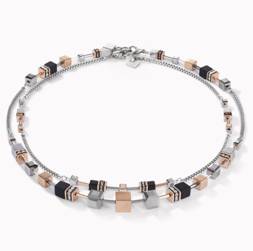 Hematit mit Titanoxid-Veredelung, Onyx, Swarovski Kristalle, Glas, Strassrondelle, Edelstahl, Edelstahl rosegold. Karabiner-Verschluss Edelstahl.